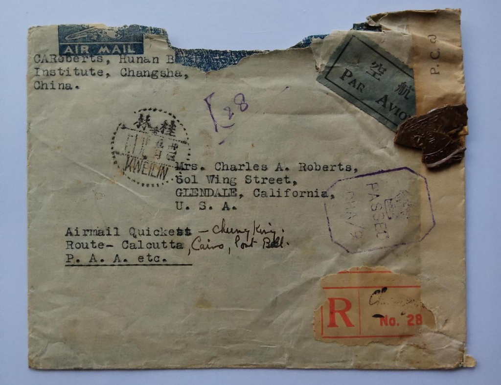 在抗战胜利80周年之际,湖南省邮史研究会会长、湖南中烟长沙卷烟厂员工段辉,这位拥有40余年集邮经历的爱好者,从珍藏的邮册中取出抗战主题藏品,为我们徐徐展开一幅方寸之间的抗战历史长卷。 长沙会战前夕的宣传邮戳,是他最珍视的藏品之一。他轻轻抚过一枚泛黄信封,方形邮戳旁“自强不息”“还我河山”等字样虽已模糊,却仍透着当年的激昂。1938年日军逼近湖南,邮局刻制这批邮戳寄往全国,既是动员宣传,也是凝聚民心的无声呐喊。“‘还我河山’四个字,无论何时看都让人热血沸腾。”他语气中透着敬意。 一枚斑驳的试航封静静陈列在一旁。这是1942年5月25日从湖南寄往美国的驼峰航线试航封。段辉指着封面上的字迹,讲述滇缅公路被切断后,中美飞行员在喜马拉雅山脉开辟“生命线”的艰险历程。试航期间邮件极为罕见,目前发现不足5件。“坠毁的飞机多达600架,每一枚试航封都承载着国仇家恨与血泪情殇。”他感慨道。